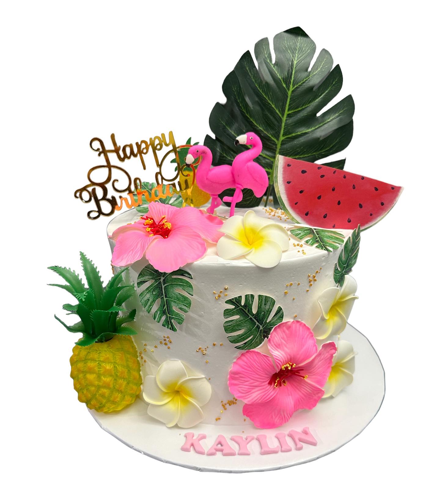 **Vendor will contact you after deposit is paid for Cake Design and Flavors.** Transport your taste buds to a tropical paradise with our Tropical Cake, a vibrant and flavorful dessert that captures the essence of island life. This cake is a burst of exotic flavors, featuring a medley of tropical fruits and vibrant designs that make it perfect for beach parties, Hawaiian luaus, or summer gatherings. Dive into a slice of paradise as you savor the tropical goodness of this cake and let its cheerful aesthetics infuse your celebration with sunshine and joy. Make your event an island escape with our Tropical Cake.